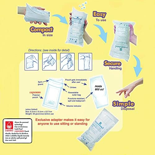 Non-toxic, odourless, spill proof gel. It instantly gels after absorption of liquid thus making it leak-proof! No closure needed but comes with a resealable strip Waste disposal safe, simply throw away after use Small and light weightCompact enough for any handbag, glove compartment or travelbag Reusable until it is full – 800ml capacity LIQSORB super absorbent polymer pouch included that traps urine bacteria Volume indicator and full instructions included on the urinal Unisex plastic collar for easy handling – For Men, Women and Children
