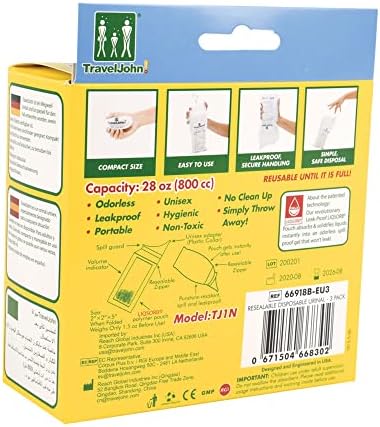 TravelJohn resealable disposable urinal is convenient, sanitary, discreet and compact solution. Ultimately a travel toilet that is a Civilised Solution, Anytime, Anywhere! Each Bag is made of strong plastic, that is puncture resistant and contains our Revolutionary LIQSORB polymer pouch that solidifies liquids instantly into a Leak-proof, odourless, spill-proof gel that is non-toxic and safe for disposal in any waste bin. Product Features: – Non-toxic, odourless, spill proof gel. It instantly gels after absorption of liquid thus making it leak-proof! – No closure needed but comes with a resealable strip – Waste disposal safe, simply throw away after use – Small and light weight – compact enough for any handbag, glove compartment or travelbag – Reusable until it is full – 800ml capacity – LIQSORB super absorbent polymer pouch included that traps urine bacteria – Volume indicator and full instructions included on the urinal – Unisex plastic collar for easy handling – for Men, Women and Children
