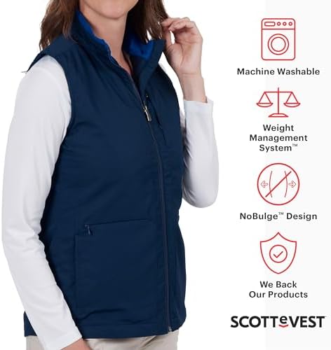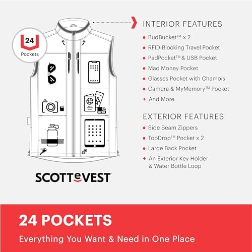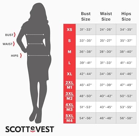 The SCOTTeVEST Best Travel Vest for Women is your all-in-one travel essential clothing! Featuring 24 pockets this vest was engineered to keep you safe, organized and connected. Concealed pockets to store your travel documents, ID, camera, bluetooth headset, cell phone, tablet, Kindle, book, maps, magazines, sunglasses, and so much more. Whether you are looking for a tactical vest, photography vest, security vest, safari vest, or simply a casual vest for women that looks great SCOTTeVEST has you covered. Never leave home again without the protection and comfort of SCOTTeVEST! Machine Washable. Available in multiple sizes. 2 Year Warranty. Please reference the sizing chart in the image carousel to ensure you select the correct size.