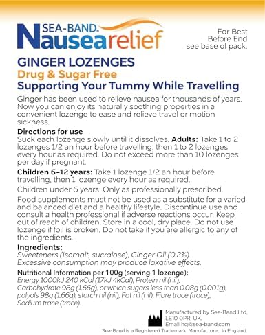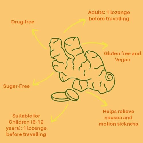 A natural, drug-free, non-drowsy remedy for the clinically proven prevention and relief of travel and motion sickness. Ginger has been used as a medicinal herb for thousands of years. Now you can enjoy its natural soothing properties in an lozenge that gives you a healthy boost of ginger on-the-go! This travel size pack with 24 lozenges allows you to take drug-free, relief from travel and motion sickness wherever you go Perfect for use before or during long journeys by car, boat, train or plane, it’s also gluten free and suitable for vegetarians and vegans Directions for use: Suck each lozenge slowly until it dissolves. Adults: Take 1 to 2 lozenges 1/2 an hour before travelling; then 1 to 2 lozenges every hour as required. Children 6-12 years: Take 1 lozenge 1/2 an hour before travelling, then 1 lozenge every hour as required.